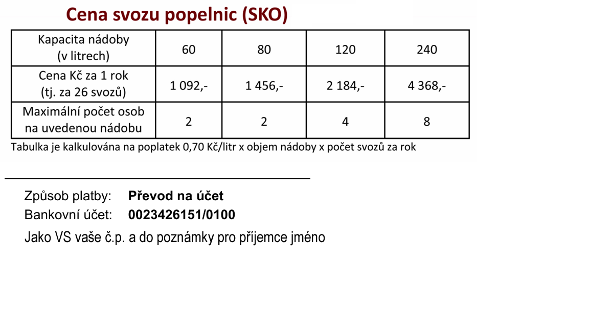 Popelnice - 2026 Známku na popelnici je nutné si vyzvednout v obecní knihovně každé pondělí 16-19 hod., platit je možno tamtéž hotově nebo na účet obce viz. příloha. Poplatek by měl být zaplacen a známka vyzvednuta do konce února 2026, děkujeme. Příloha - včetně výše poplatku za svoz popelnic
